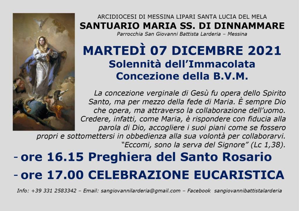 MARTEDÌ O7 DICEMBRE Solennità dell’Immacolata Concezione della B.V.M
