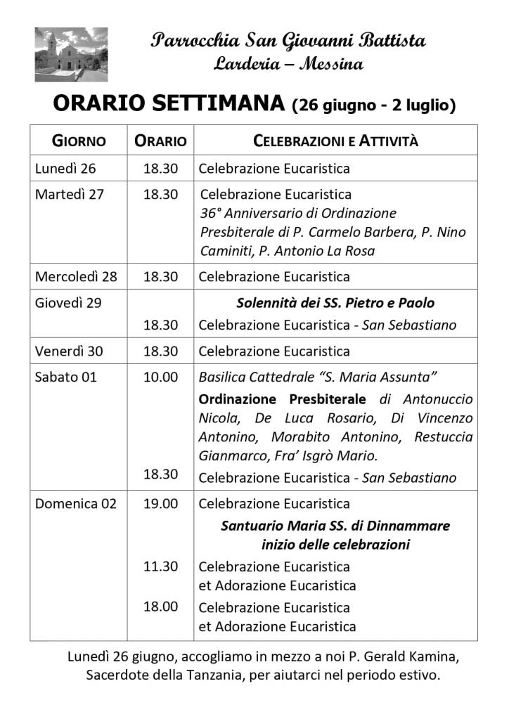 Orario settimana 26 giugno-02 luglio