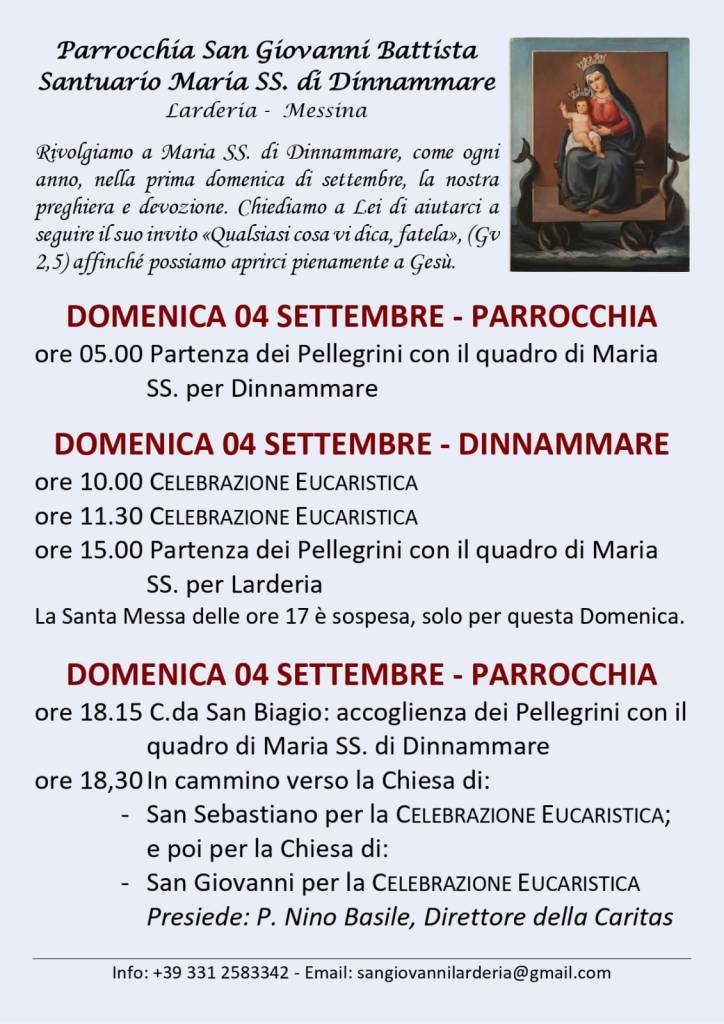 Mercoledì 07 Ottobre 2020 in occasione della Memoria della Beata Vergine Maria del Rosario alle ore 17:00 presso il Santuario Diocesano Maria SS. di Dinnammare ci sarà la Celebrazione Eucaristica.